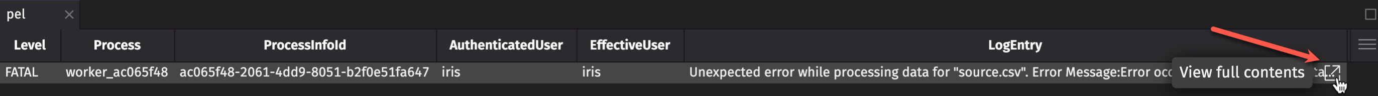 Hold your mouse over LogEntry and click on the View full contents button that appears to view the full exception message and stack trace from the results of the query.