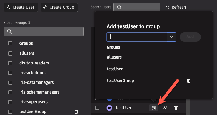 To add an existing user to a group, click on the group icon next to the user's name, and then select a group from the dropdown menu. You can also create a new group this way: just type the new group's name into the text field at the top of the dropdown menu, and then click Add.