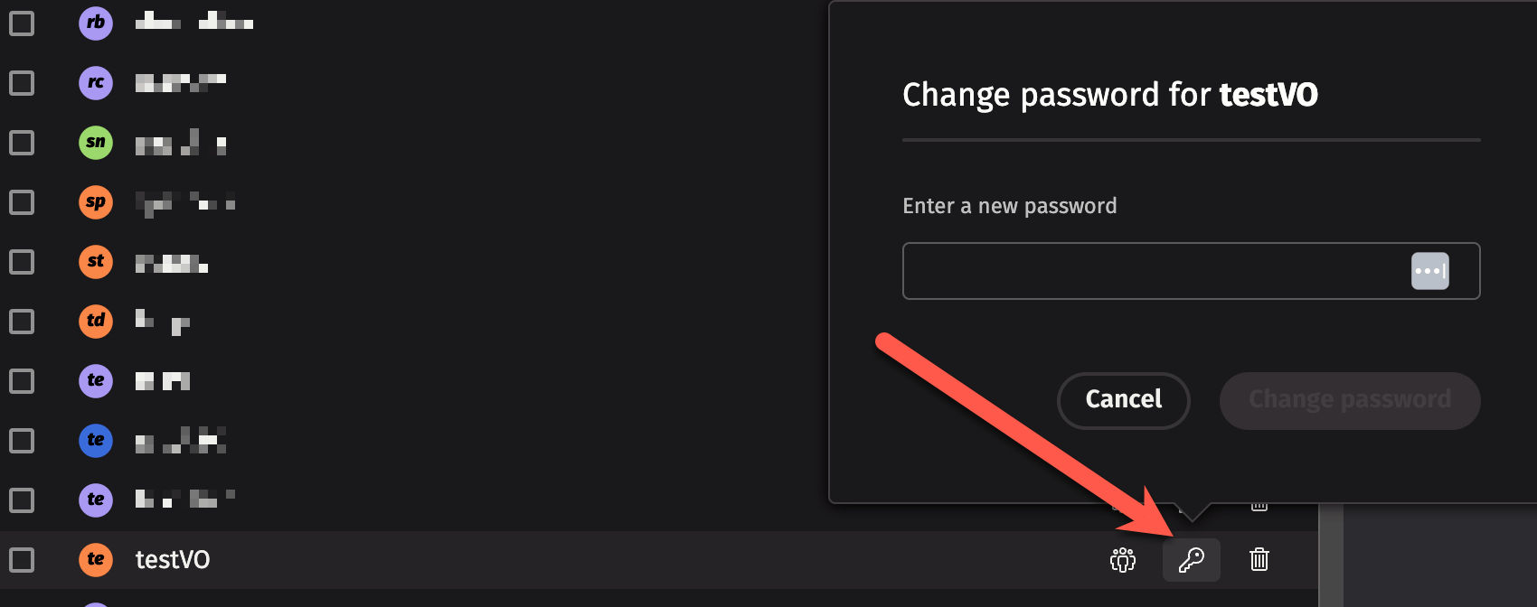 Deephaven's default system configuration stores passwords (hashes) for users. In this case, if your current user profile has the authority, you can change a user's password by clicking on the key icon next to the user's name and then typing in a new password.