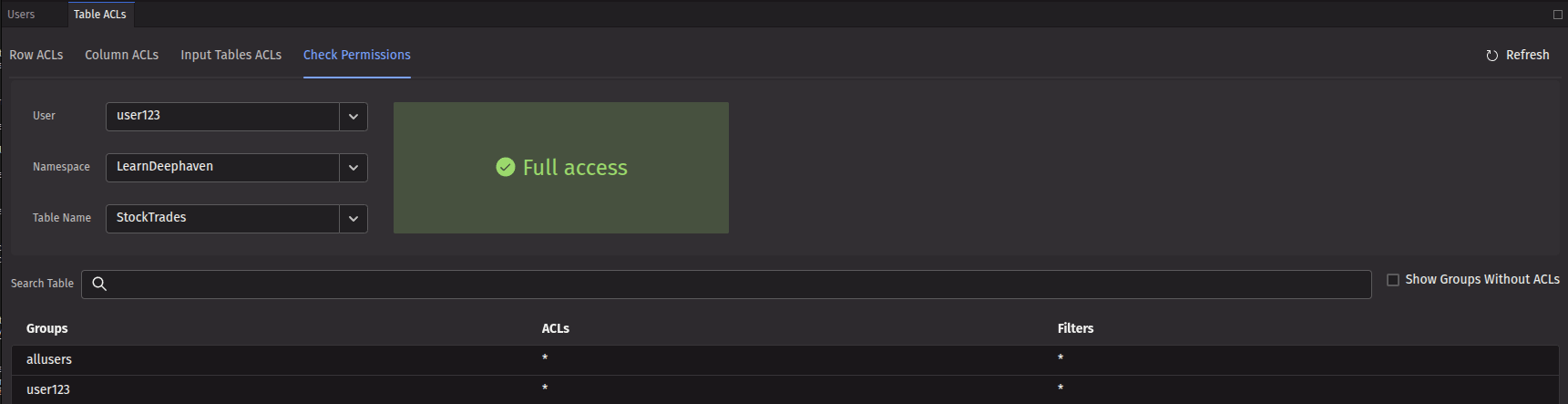 The Check Permissions tab provides administrators a way to verify what access a particular user has to a given table. This is useful for validating that ACLs are working as expected. Select the appropriate user, namespace, and table in the dropdown menus, and the UI will display the resulting permission level for the user on that table, along with a full list of all the ACLs that apply to that user for that table. The example below shows the permissions for user123 in regard to the LearnDeephaven namespace and the StockTrades table. The large "Full access" text indicates that the user has full access to the table. The bottom part of the panel shows the ACLs that were used to compute this permission level, and indeed that full read permission is allowed for that user (as noted by the *).