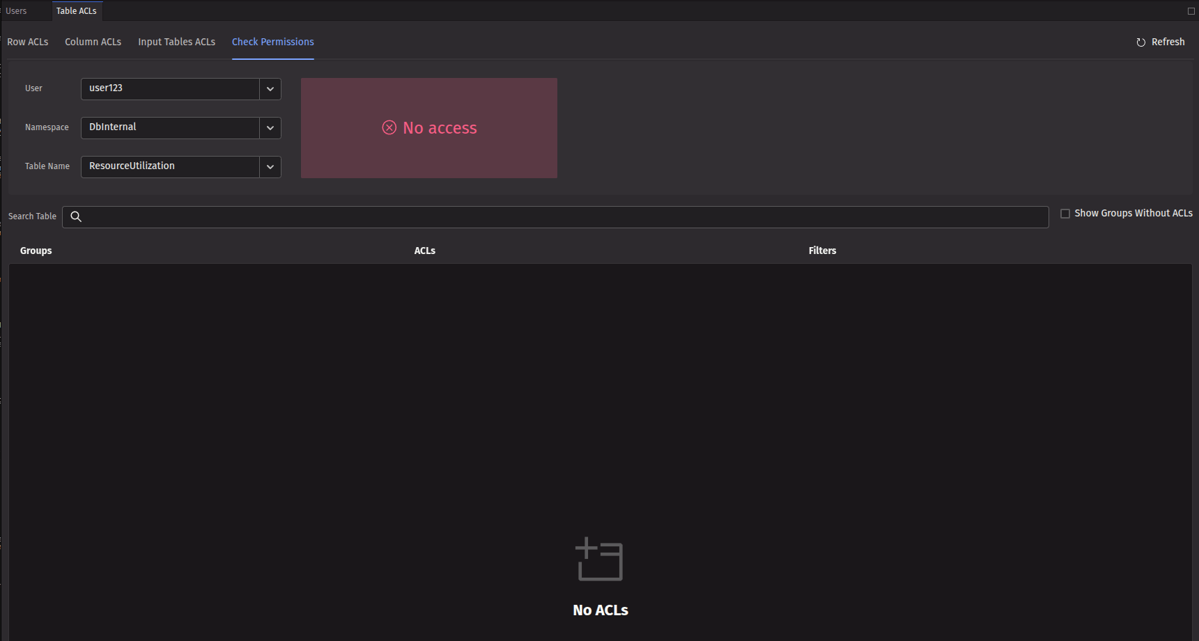 - Table data access — If a namespace or table has ACLs that restrict access to only