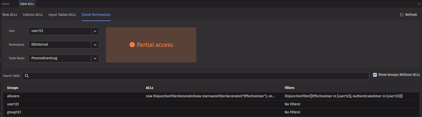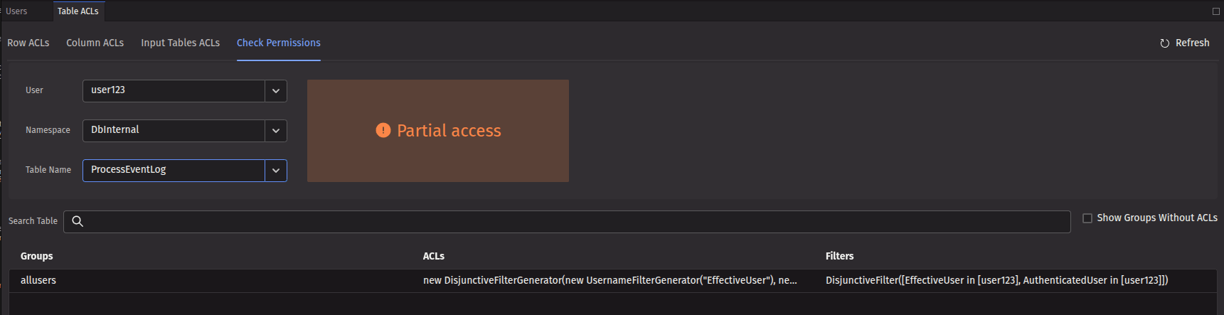 If you select a combination that only applies partial access, the resulting permission level will be shown as "Partial access", along with the specific row and column filters that apply to that user for that table. The example below shows again user123, but this time for the namespace DbInternal and the ProcessEventLog table. The user has partial access, with a filter that only allows viewing rows where EffectiveUser and AuthenticatedUser match user123.