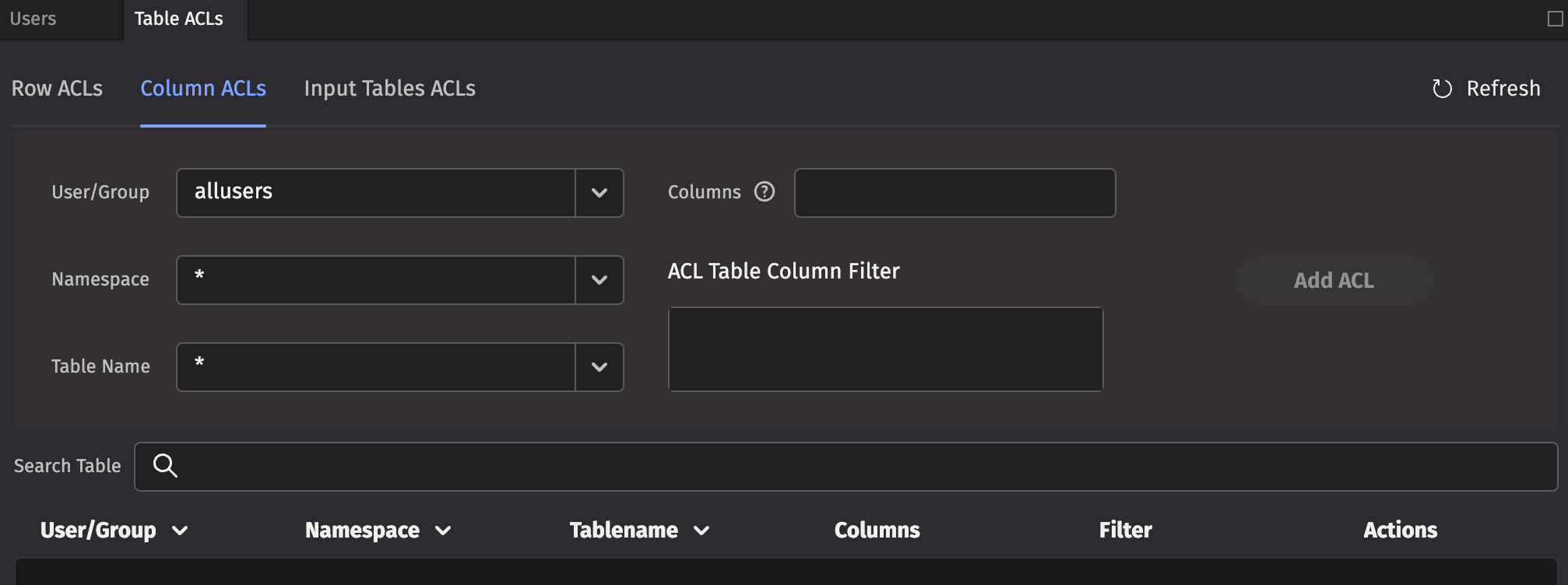 *for all columns. Note that the columns must exist for the table or tables denoted by the above parameters. - ACL Table Column Filter: A string that represents Java code to create a FilterGenerator for this table. Instead of filtering rows out like a Row ACL, matched rows permit viewing the the specified Columns. Rows that are unmatched, replace the actual column values with