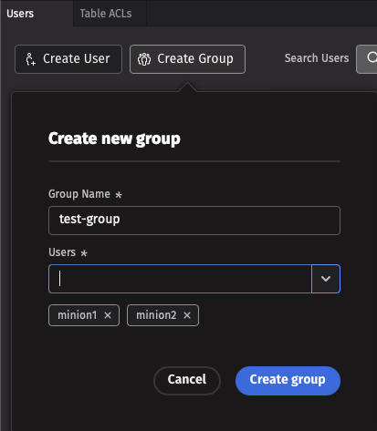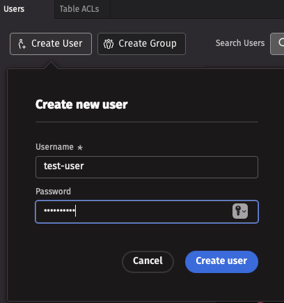 The Users tab at the top left of the ACL editor contains options for creating users and groups. Permissions can later be set for either individual users or groups in the Table ACLs tab.