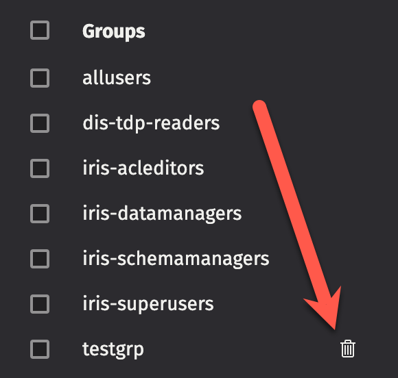 To delete a group, click the trash can icon next to the group name. Note that some special groups, like allusers, cannot be deleted.