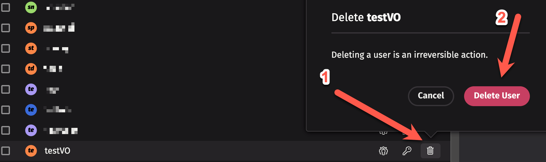 To delete a user, click the trash can icon next to the user's name, and then click "Delete User".