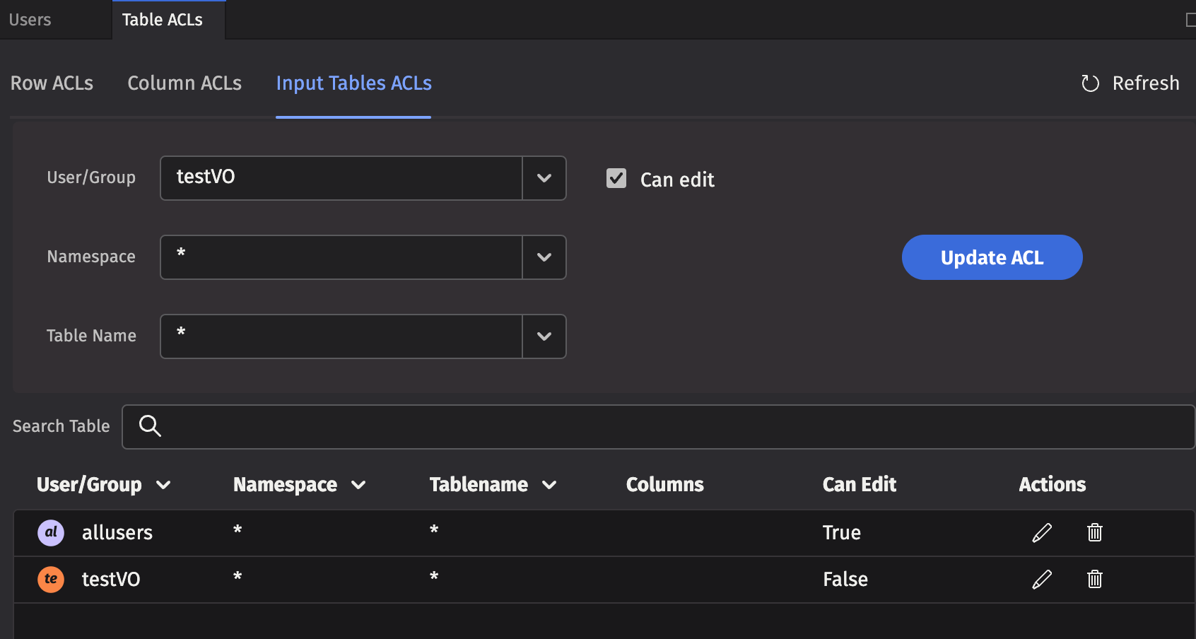 Setting the authorization for individual/group access for reading data in tables is accomplished through the Table ACLs tab. However, setting the authorization of individuals or groups to edit tables is accomplished in the Input Tables tab.