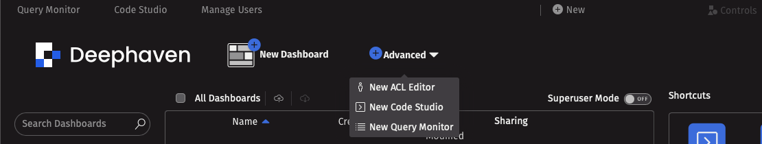 The easiest way to configure permissions in Deephaven is through the ACL Editor. To create a new ACL editor, click New at the top of your Deephaven IDE, and then select the ACL Editor from the Advanced tab: