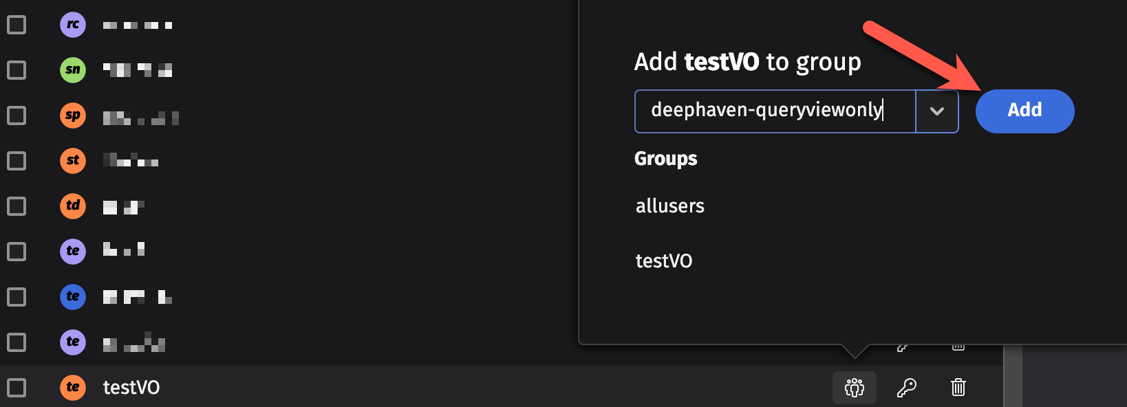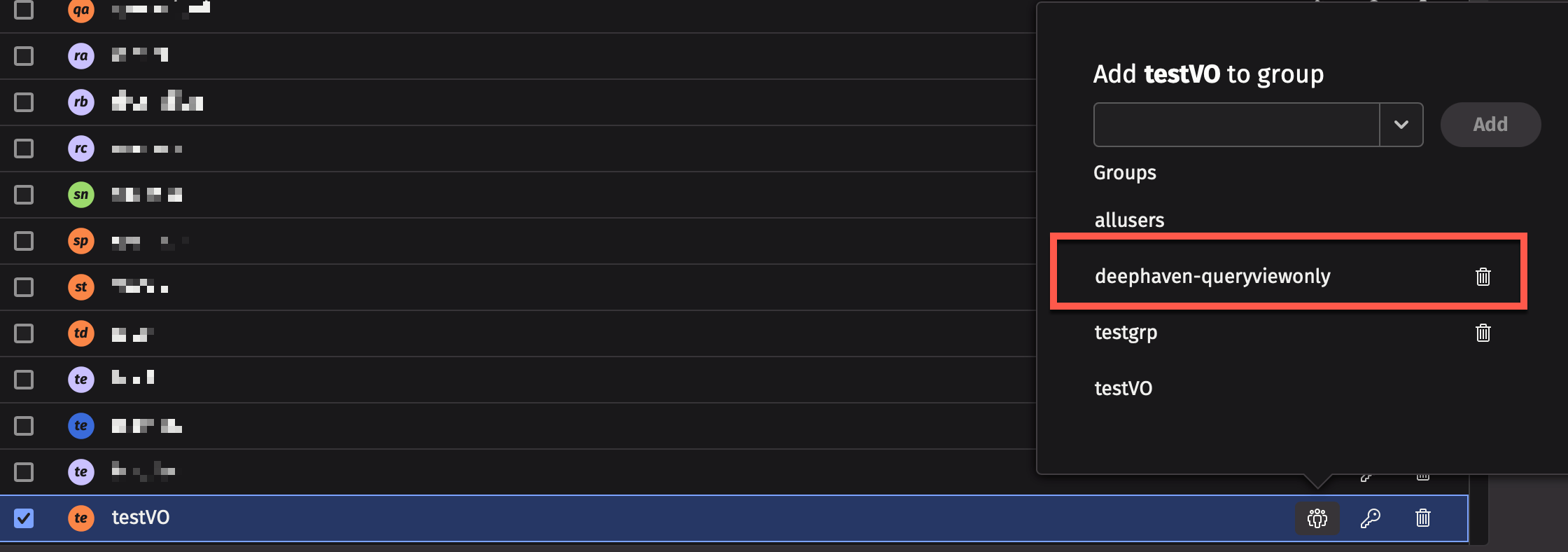 If the group does not exist yet, type deephaven-queryviewonly and click Add. This creates the group and adds the user to it.