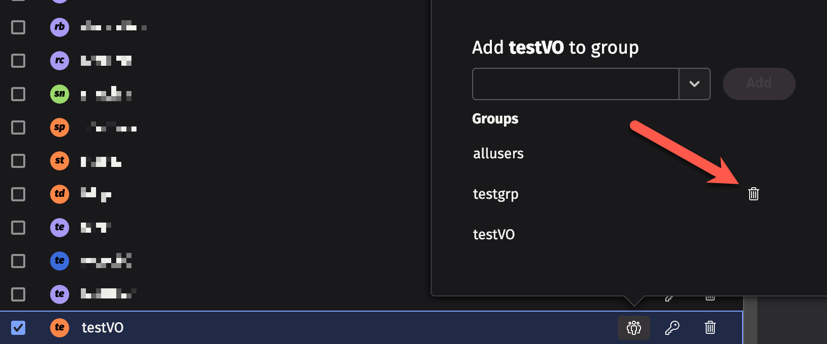 To delete a user from a specific group, click on the group icon next to the user's name, and then click on the trash can icon next to the group name from which you want to remove the user.
