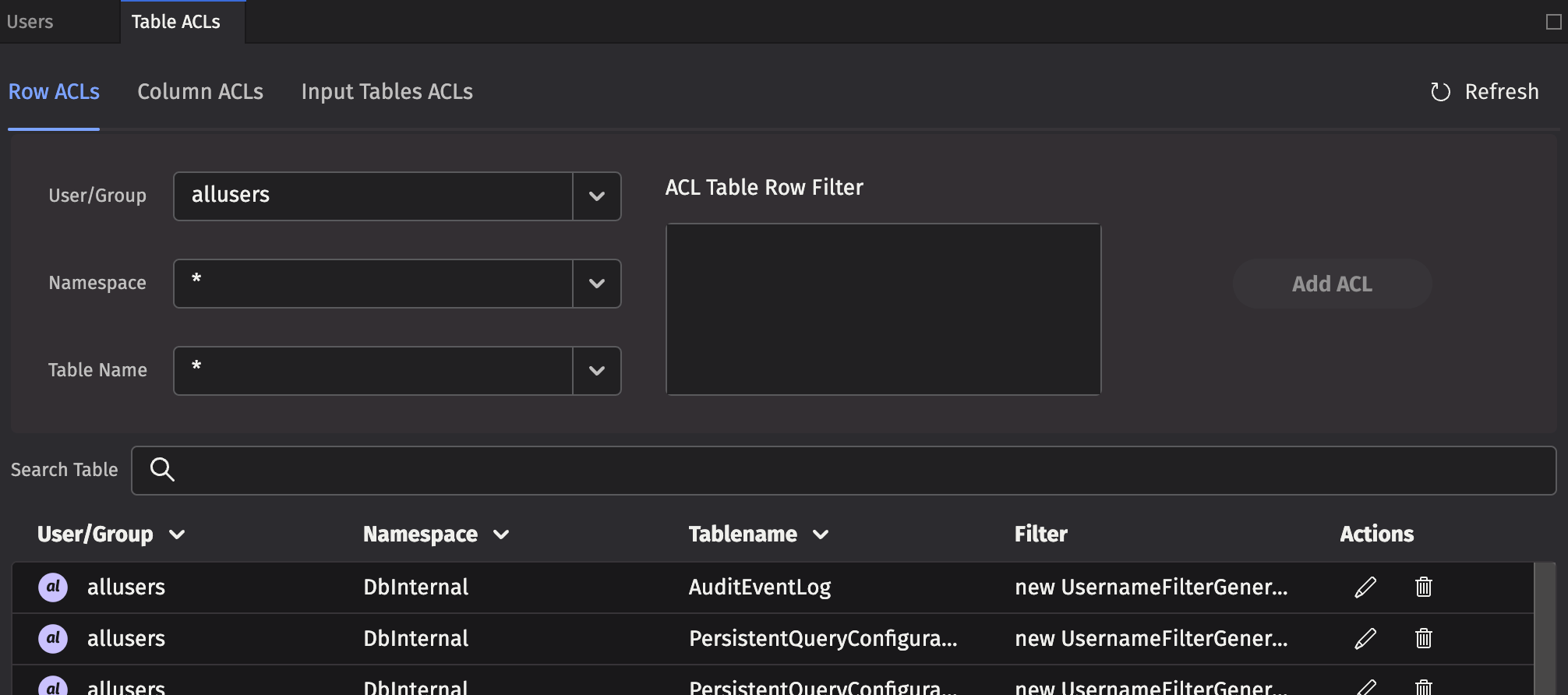 NullFilterGenerator()- Provides no access to a table; only useful to override a less-specific ACL for a group.ConjunctiveFilterGenerator(fg1, fg2, ...)- Runs filter generators fg1, fg2, etc., and returns a filter that is the conjunction of the filters returned by the passed-in filter generators. You can use this to further restrict the output of another filter generator.CopyFilterGenerator(Namespace, Table)- Copies the ACLs from another table to this table.CombiningFilterGenerator(Type)- ACLs are normally applied disjunctively. In some cases, users may want to override this behavior and combine some group filters conjunctively instead. This generator is initialized with the operation type desired (Type.ConjunctiveorType.Disjunctive) and as a single methodaddFilter(group, generator)to which specific filter generators can be added. Note that this generator is intended for programmatic ACLs.TimeSeriesFilterGenerator(Period, Column, ExcludeRecent)- The TimeSeriesFilterGenerator is used to include or exclude recent rows as defined by the Period and Column. The Period is expressed as a String duration. To exclude recent rows (e.g., market data within the last), setexcludeRecenttotrue(e.g.,new io.deephaven.enterprise.acl.generator.TimeSeriesFilterGenerator("PT15m", "ExchangeTimestamp", true)). For convenience, you can use theio.deephaven.enterprise.acl.AclFilterGenerator.outOfWindowandio.deephaven.enterprise.acl.AclFilterGenerator.inWindowstatic methods. Note that theTimeSeriesFilterGeneratoris only available in Core+ workers. If you include aTimeSeriesFilterGeneratorin a Table's ACLs, then the table may not be accessible in Legacy (depending on ACLs defined for other users the group is a member of).