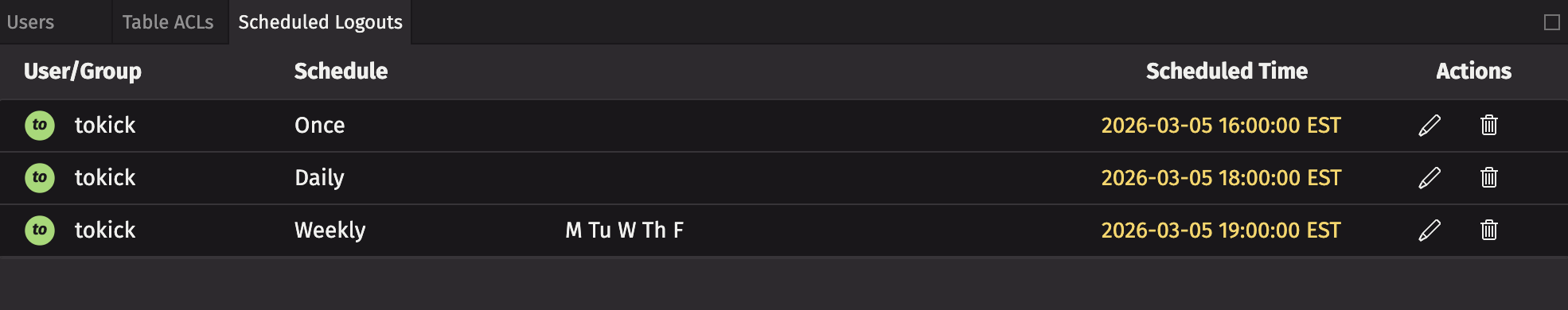 The ACL Editor provides functionality for administrators to force users to log out, either immediately or on a scheduled basis.
