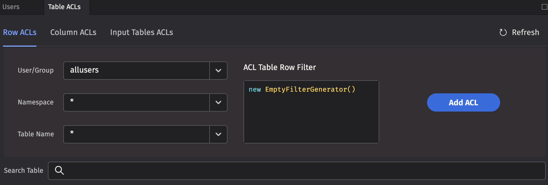 To add a new table filter, type the Java code into the ACL Table * Filter field and click Add ACL.