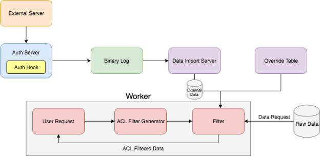 This document describes a specific use case in which an "Auth Hook" (plugin) can be created to request and parse data from an external server and then import that data into the Deephaven system. The imported data may then be utilized in the ACL Editor by a corresponding, custom filter generator.