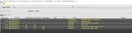 The DbInternal.AuditEventLog table provides data access audit events, both for access to tables and for access to PQs. Data access events will generally have rows where the Process value is worker_n; worker processes are those that back Persistent Queries, query consoles, and remote clients that are actually accessing data. Most events logged from worker processes will be related to data access and include details about the user, table, and namespace being accessed. More detailed information about queries and scripts being executed are logged to the DbInternal.ProcessEventLog. This log captures all activities and errors/exceptions raised within worker execution.