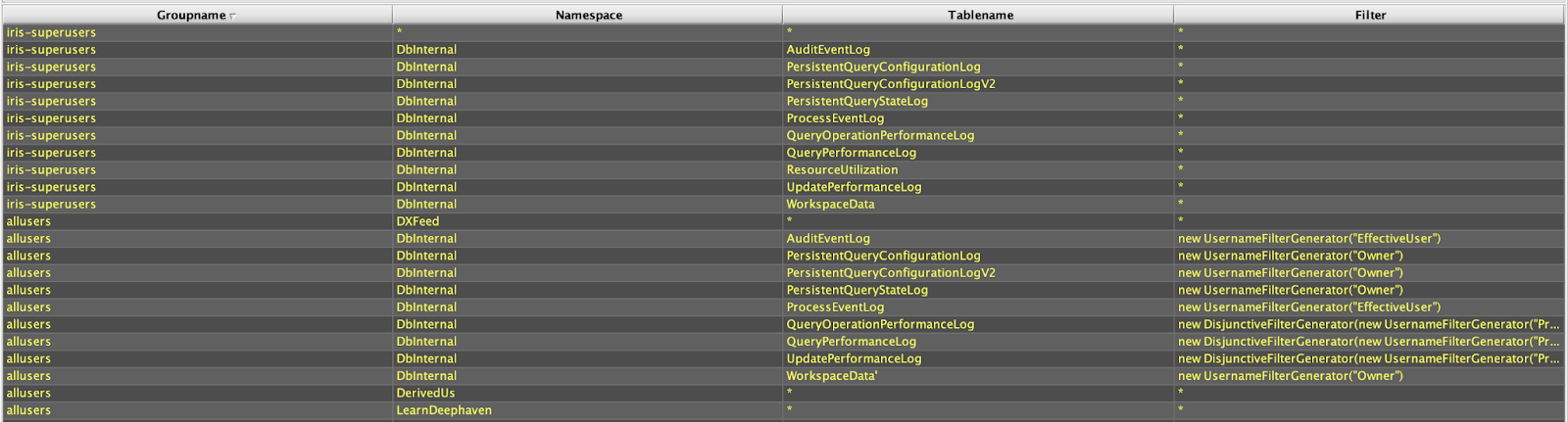 The screenshot above (from the ACL Editor utility in the Deephaven Swing client) shows default Table ACLs that exist in Deephaven. The iris-superusers group has explicit rights to all data in all of the internal "DbInternal" tables, but also has a wildcarded right to all data in all tables that already exist or that might be added later (*,*,* permissions). The allusers group, on the other hand, has full access to example tables in the LearnDeephaven namespace, and filtered access to data in other DbInternal tables. The use of an ACL filter object instead of * in the filter column indicates that row data from the table will be filtered, so regular users will only see some of the data in these tables. The DXFeed and DerivedUs permissions are custom ACLs that were added after installation.