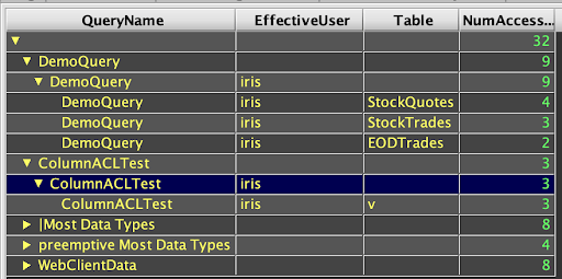 Queries and reports using data from this table can show who is accessing which tables, when, how often, and through what mechanisms (direct queries, PQs, etc). This example rollup table shows user accesses to Persistent Queries, and is opened to drill down into details such as the specific tables accessed through the queries:
