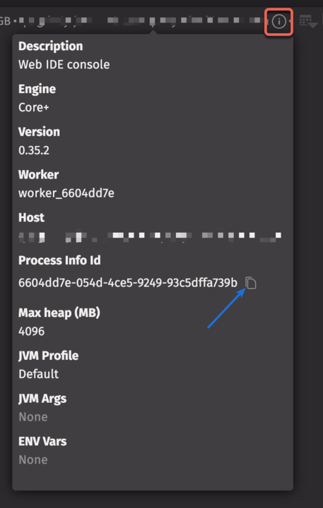 To view the PEL table for a process you must determine a unique identifier for it, preferably the ProcessInfoId. For a Persistent Query, the ProcessInfoId is found in a column in the Query Monitor panel. For interactive workers, the ProcessInfoId can be found by hovering over the ⓘ menu in the console. The ID can be easily copied to the clipboard by clicking on the icon next to the ID.