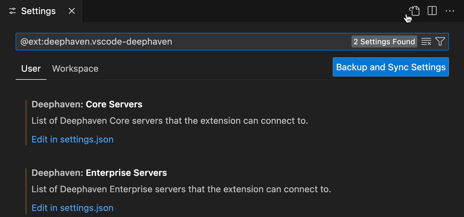 To add more servers or change the configuration of the default server, head to VS Code settings. This opens a settings UI, where you can search for the extension with @ext:deephaven.vscode-deephaven. It shows two items you can configure: